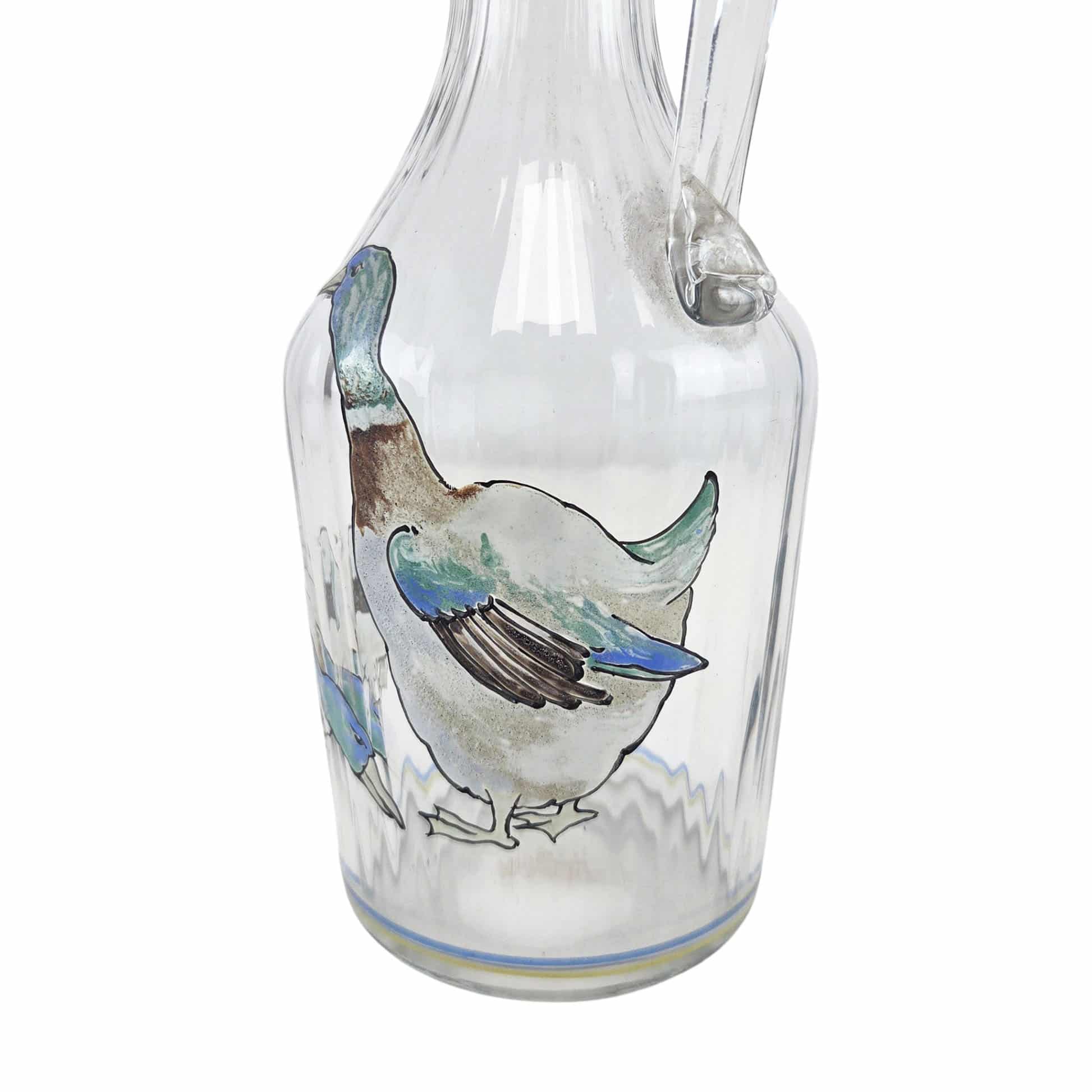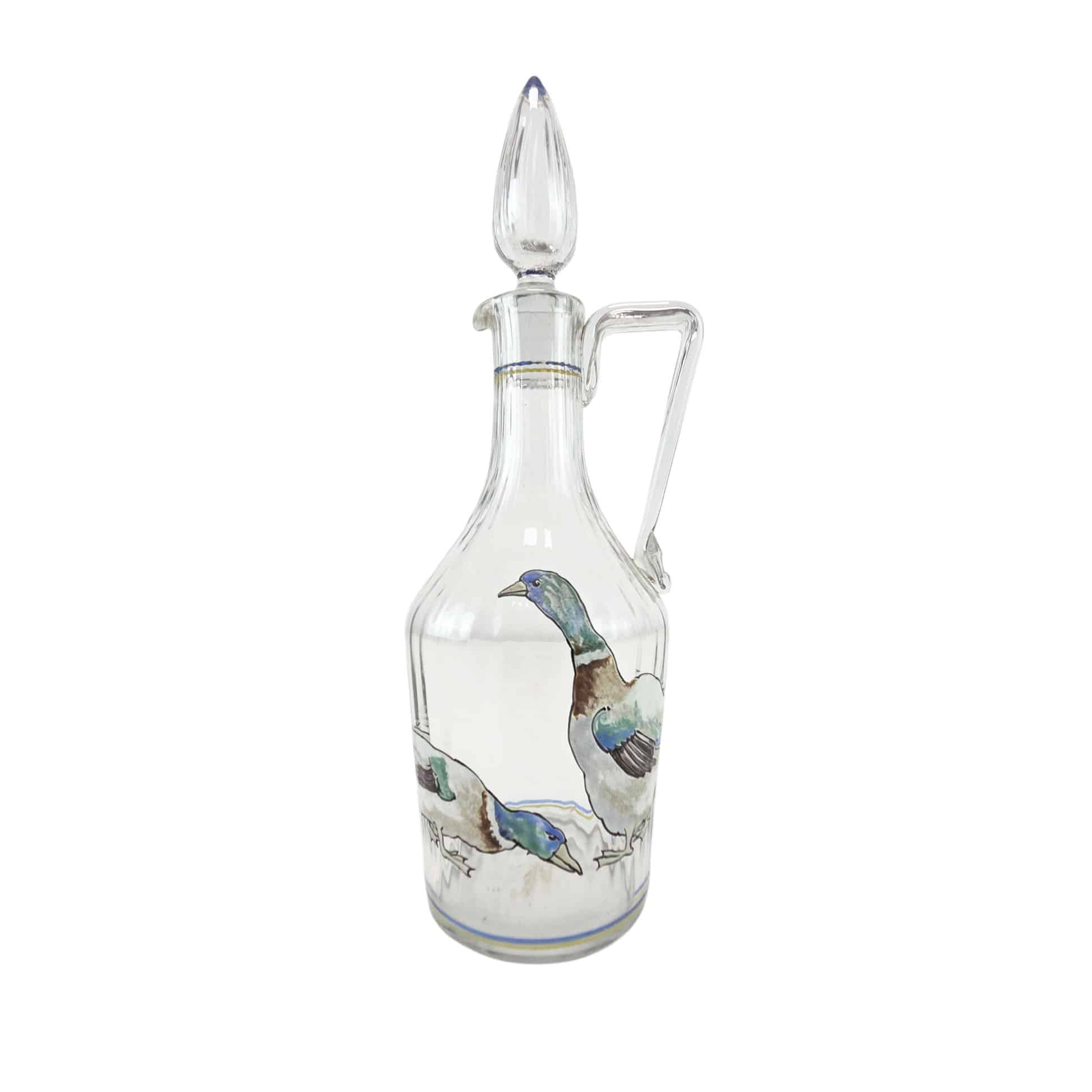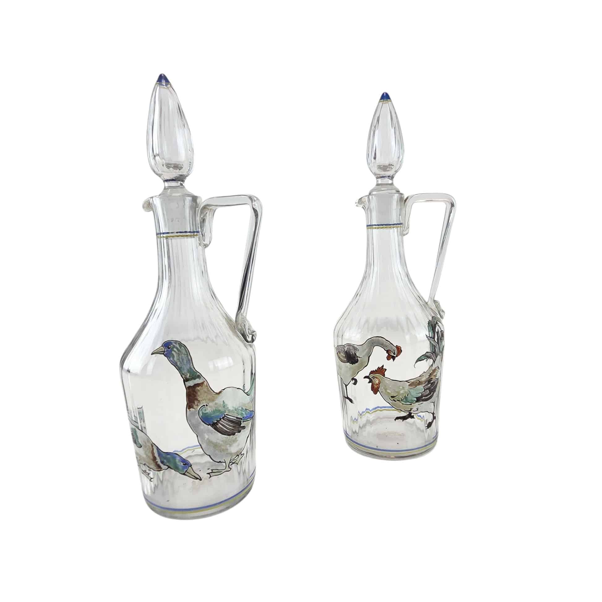 Adorable paire de carafons en verre émaillé, fin XIXème à décor de volatiles.