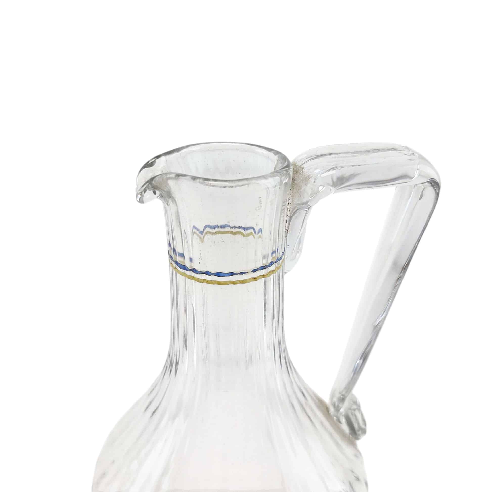 A décor de cotes, double filet bleu et jaune sur la base , le col et l’extrémité du bouchon.