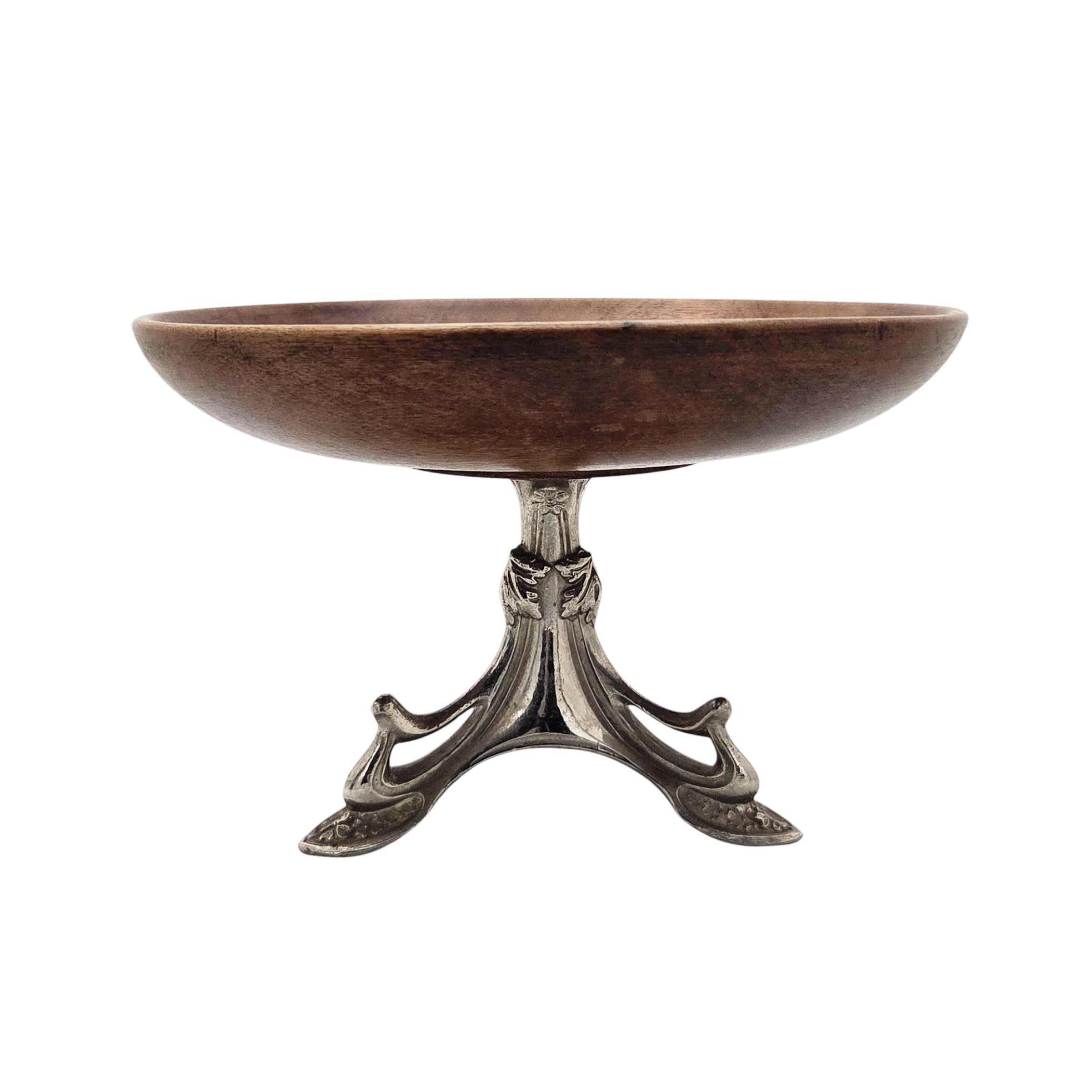 De style Art Nouveau,les deux coupes en bois reposent sur un pied tripode en métal argenté.
