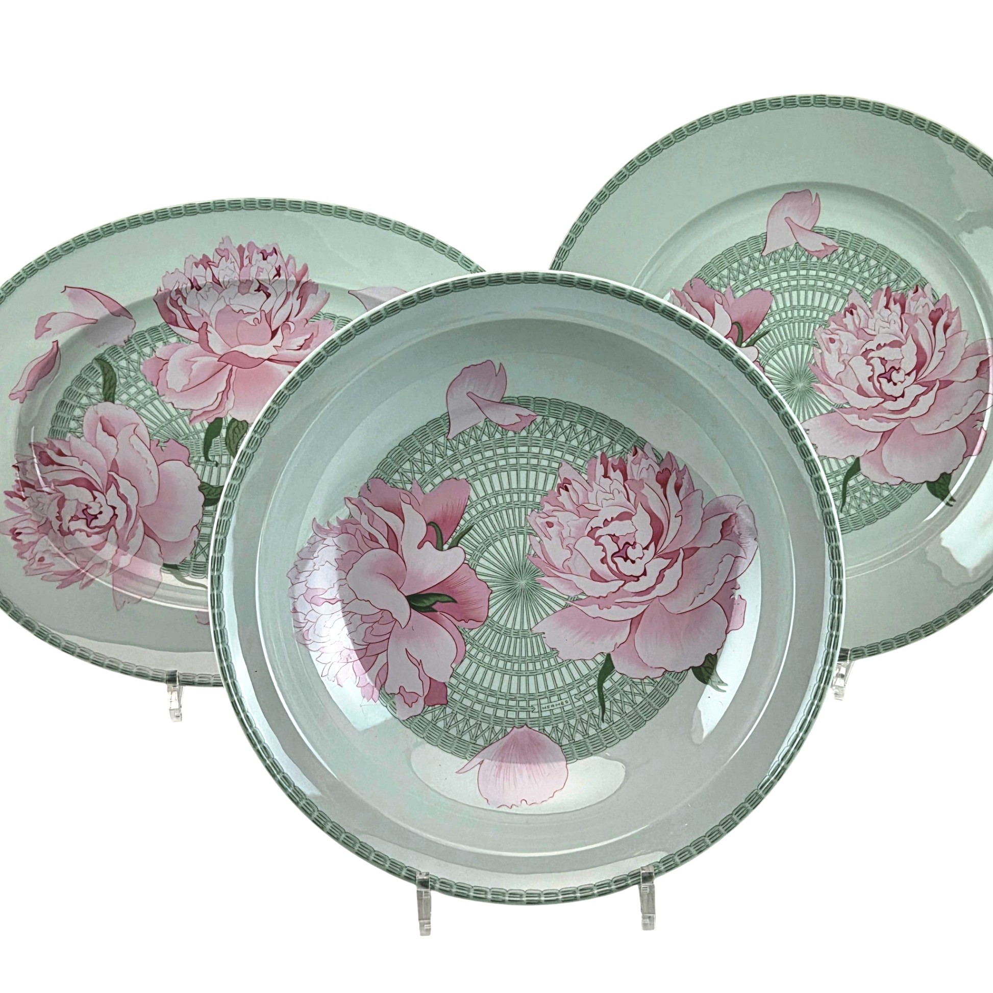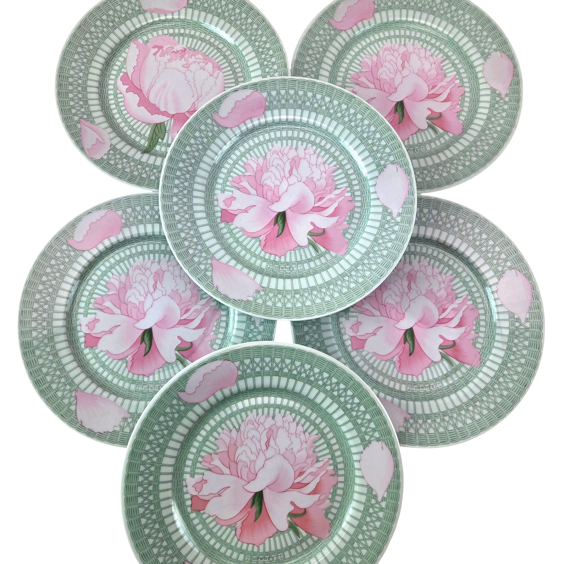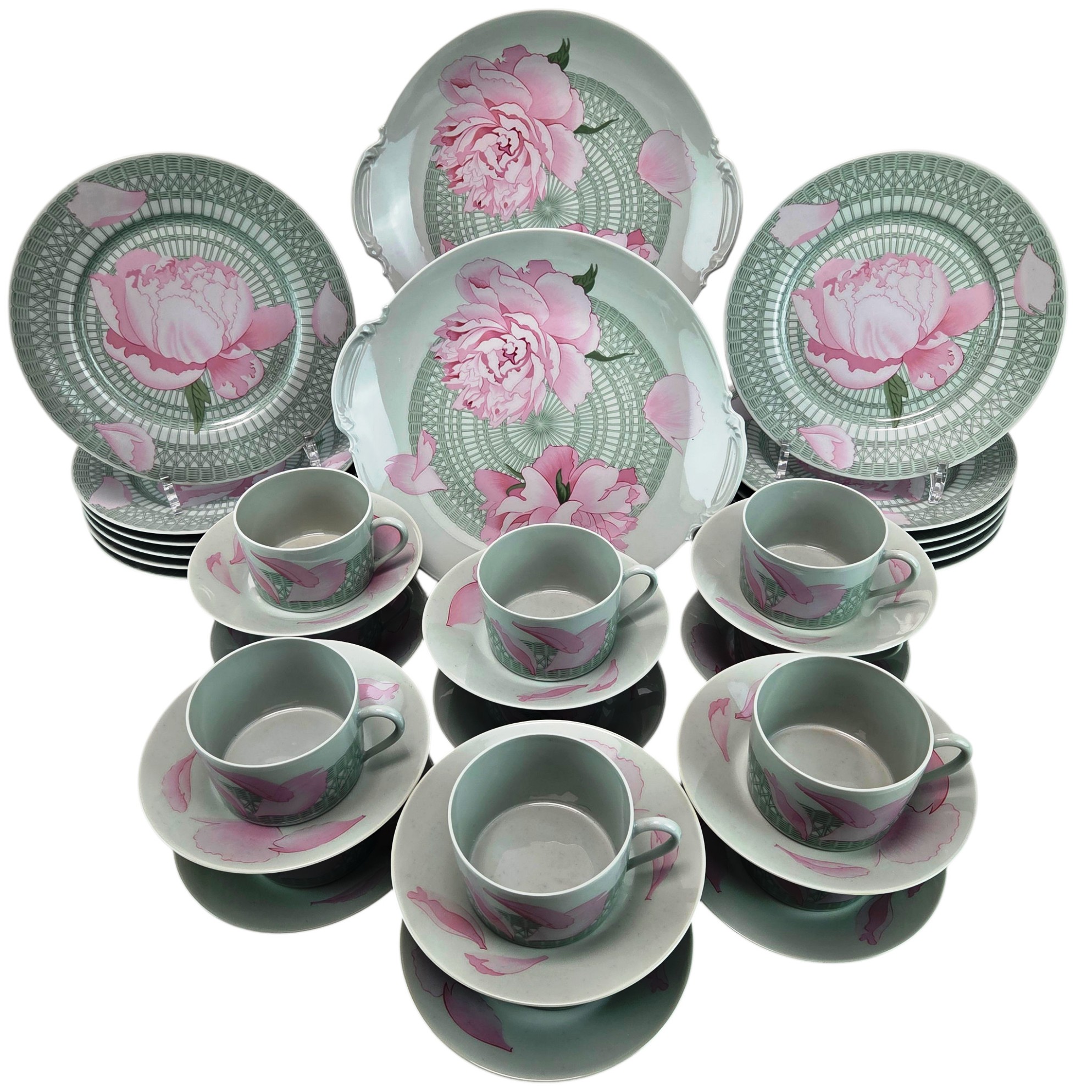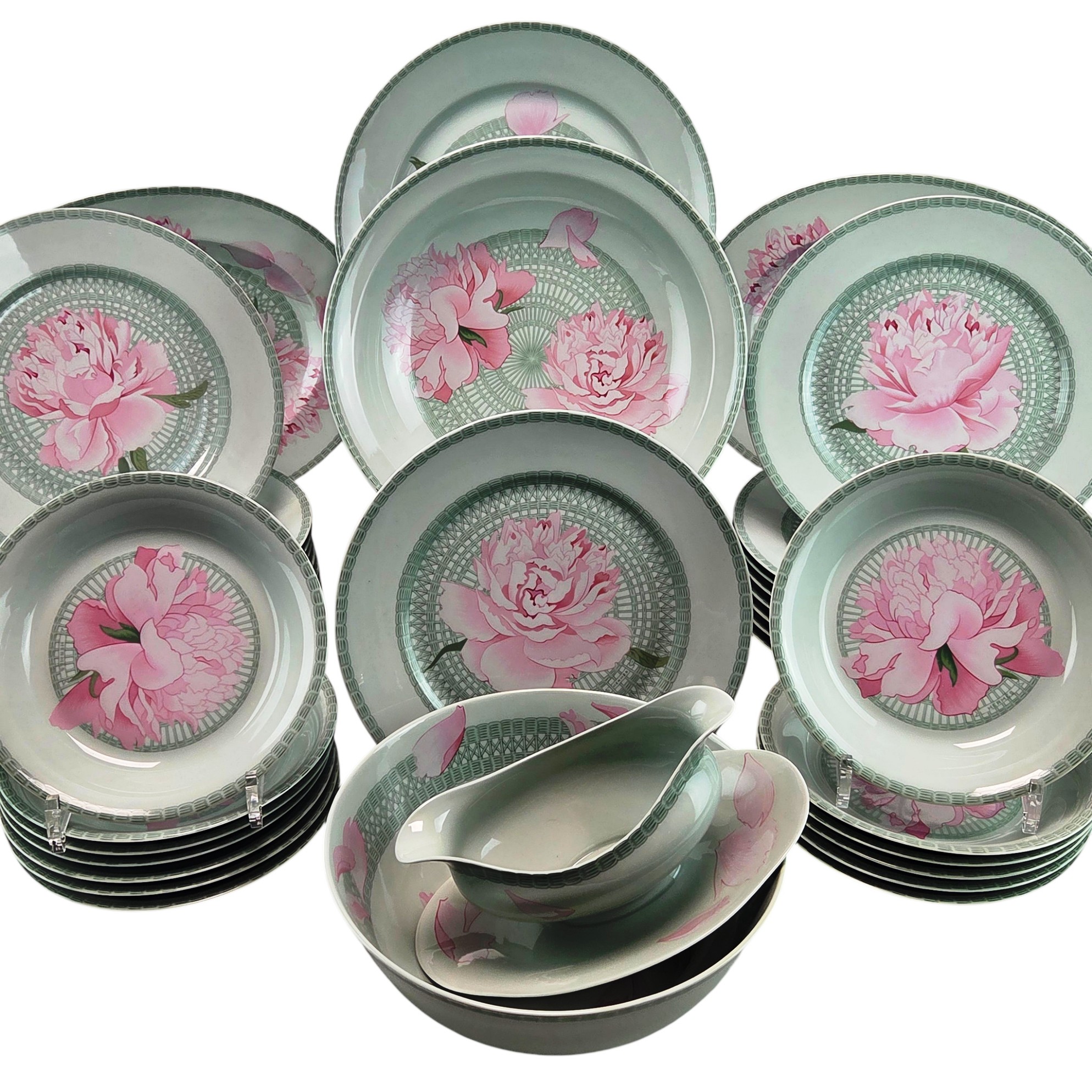 Rare service en porcelaine de Limoges, modèle Pivoines Céladon, maison Hermès, 80 pièces.