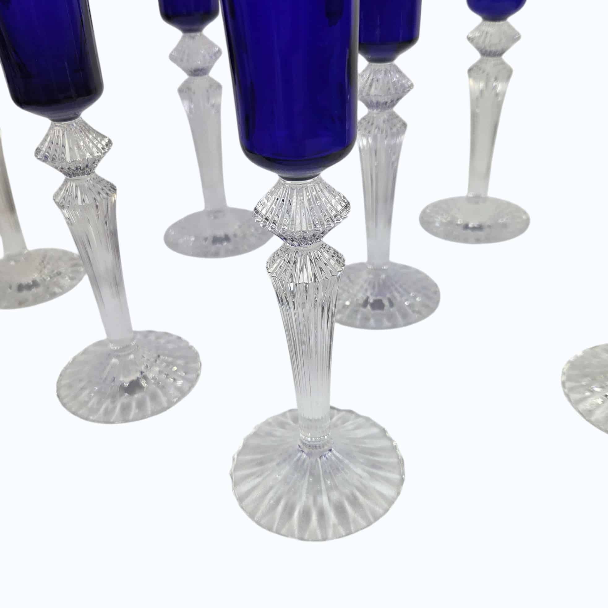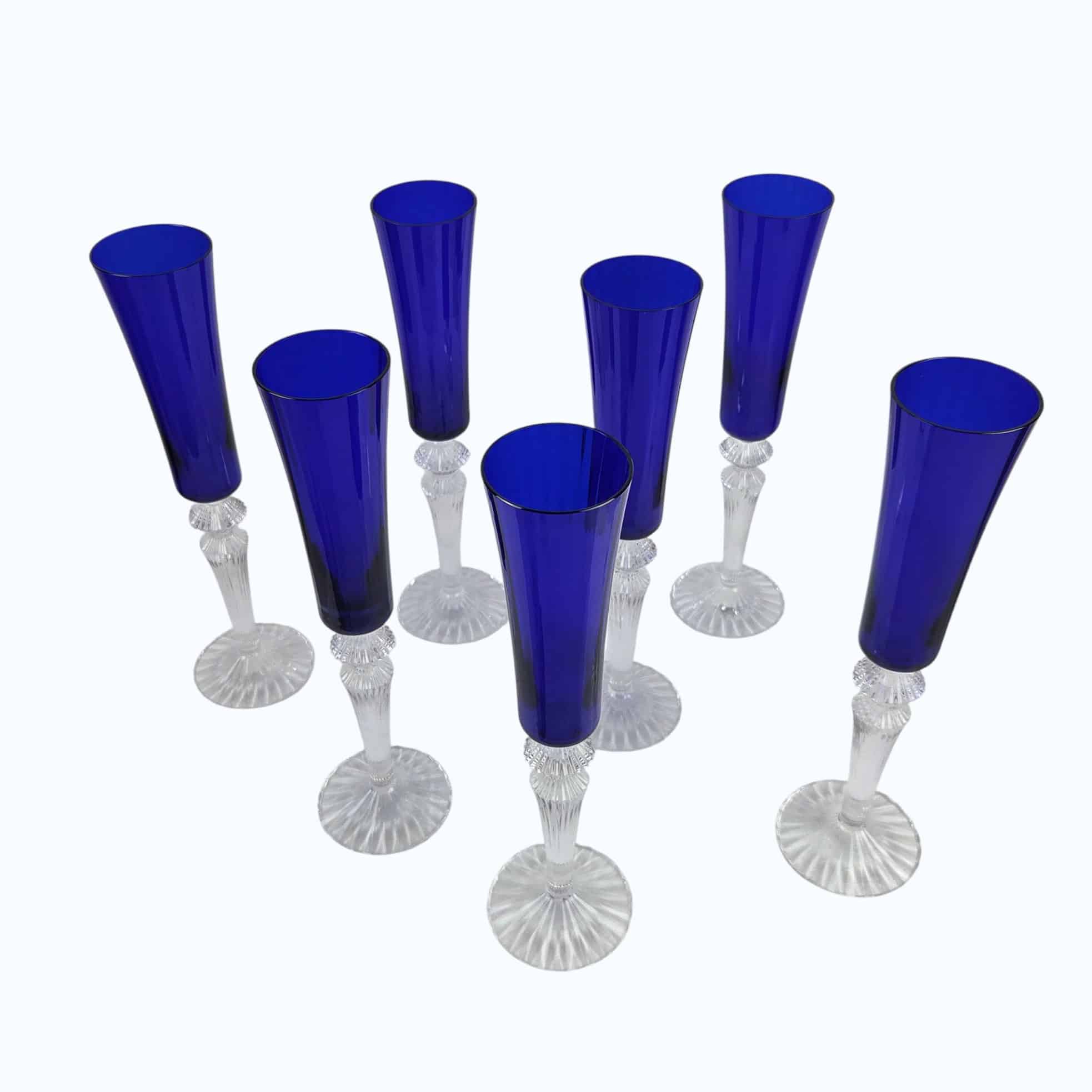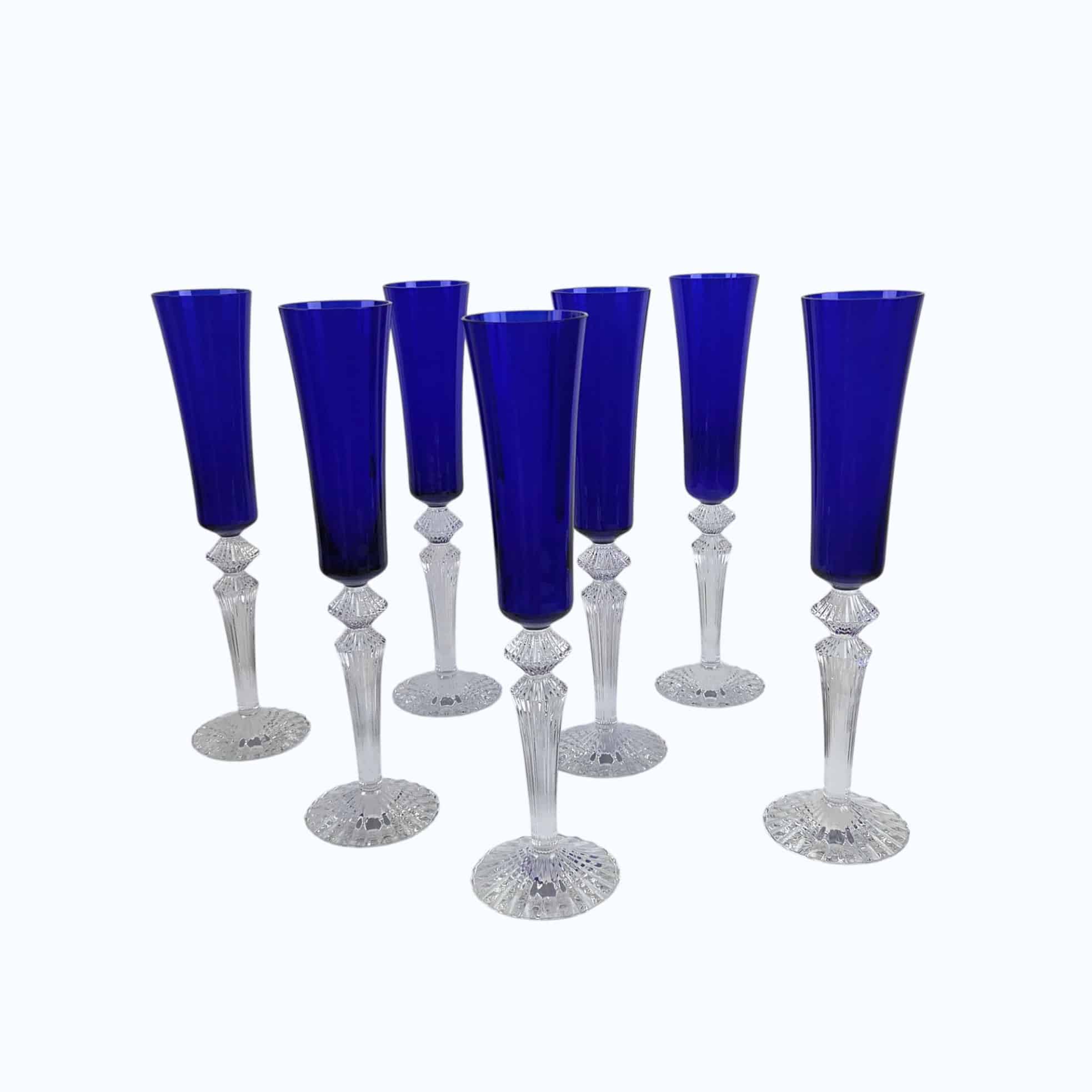 Suite de 7 flûtes en cristal de Baccarat bleues, modèle Mille Nuits.